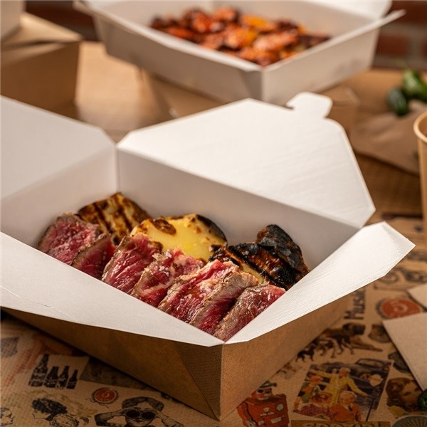 Boîte américaine en carton recyclé permettant le transport de vos repas préparés, patisseries, salades, etc. Son intérieur et son extérieur sont plastifiés, ce qui la rend hermétique et plus résistante aux fuites de sauces ou autres assaisonnements. Elle est micro-ondable, ce qui vous permet de réchauffer vos plats à emporter en toute simplicité. De plus, elle est facile à monter et est empilable ce qui permet un gain de place conséquent.