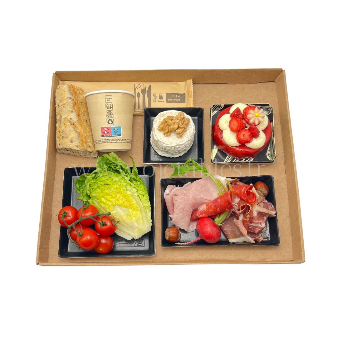 Kit plateau repas Eco en carton livré à plat comprenant le plateau repas et son couvercle ainsi que 4 raviers QUARTZ noir avec couvercle. *AF= Avec Fromage