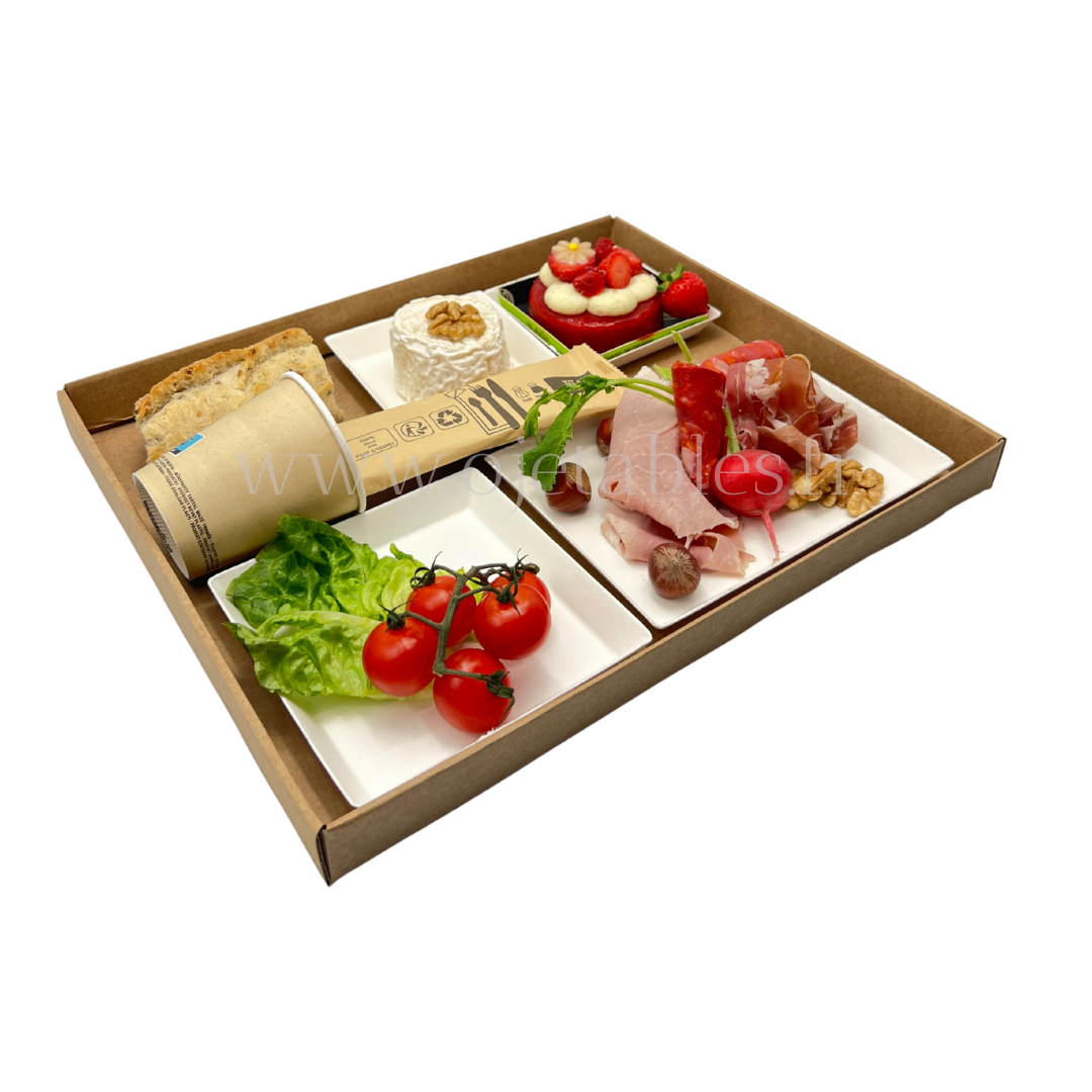 Kit plateau repas Eco en carton livré à plat comprenant le plateau repas et son couvercle ainsi que 4 raviers CUBIK blanc avec couvercle. *AF= Avec Fromage