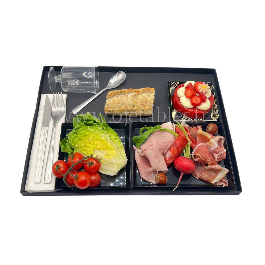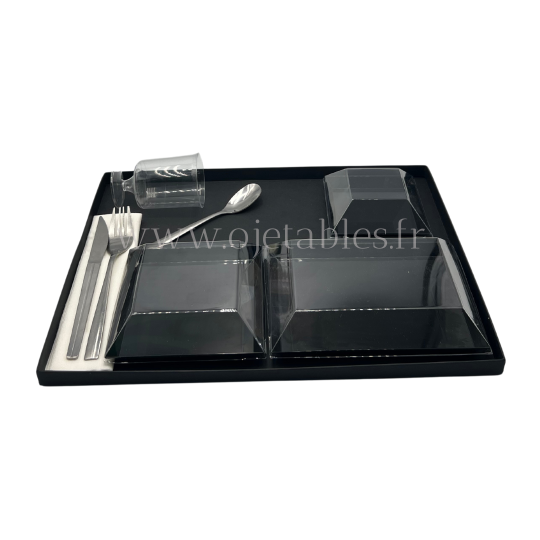 Kit plateau repas luxe en carton déjà monté comprenant le plateau repas et son couvercle ainsi que 3 raviers CUBIK noir (non micro ondable) avec couvercle. *SF= Sans Fromage